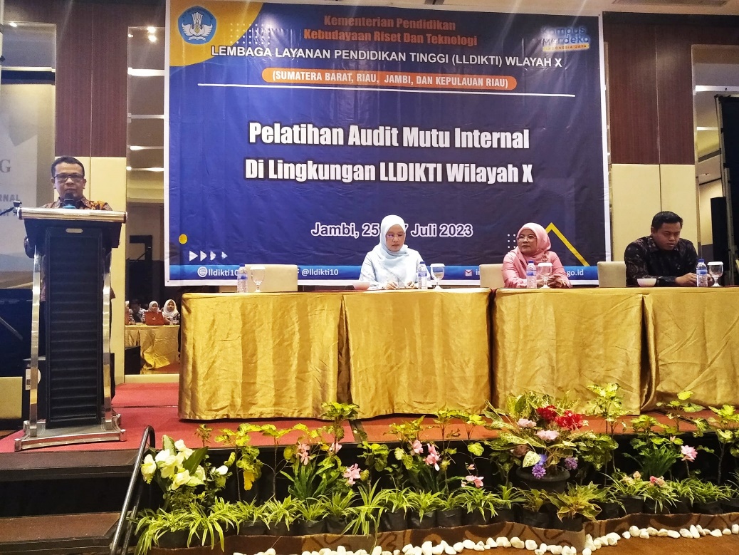 Pembukaan Pelatihan Audit Mutu Internal di Hotel Aston, Jambi 25-27 Juli 2023. Ibu Rektor dan Ketua LPMI Unrika mengikuti pelatihan AMI dan ujian kompetensi sebagai auditor AMI, Ketua LLDIKTI X menyampaikan sambutan dalam kegiatan pelatihan AMI.